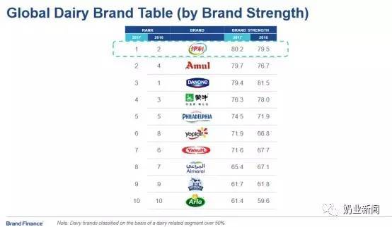 在國際品牌價值評估權威機構Brand Finance公布的2017年度Brand Finance全球乳制品品牌價值排行榜中,伊利取得了亞洲第一的優異排名。其品牌強度指數,更是位居全球第一。這創造了亞洲乳企迄今為止的最好成績。與此同時,全球知名傳播服務集團WPP發布的2017年度BrandZ?中國最具價值品牌100強榜單中,伊利同樣強勢登頂,蟬聯食品類品牌價值第一。