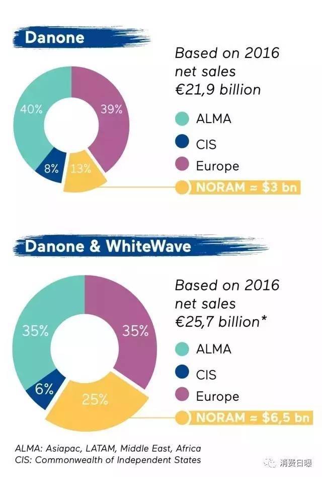 4月13日,達能宣布已經完成對知名食品企業(yè)WhiteWave的收購。達能和WhiteWave將把雙方在北美的現有業(yè)務合并成為一個戰(zhàn)略業(yè)務單元,并命名為“DanoneWave”。 2016年7月,達能宣布擬收購WhiteWave。這起收購讓達能在北美市場的地位更加穩(wěn)固,其凈銷售額將倍增到近65億美元(基于2016年雙方數據,下圖黃色板塊代表北美業(yè)務在本次收購前后占達能整體業(yè)務比重)。