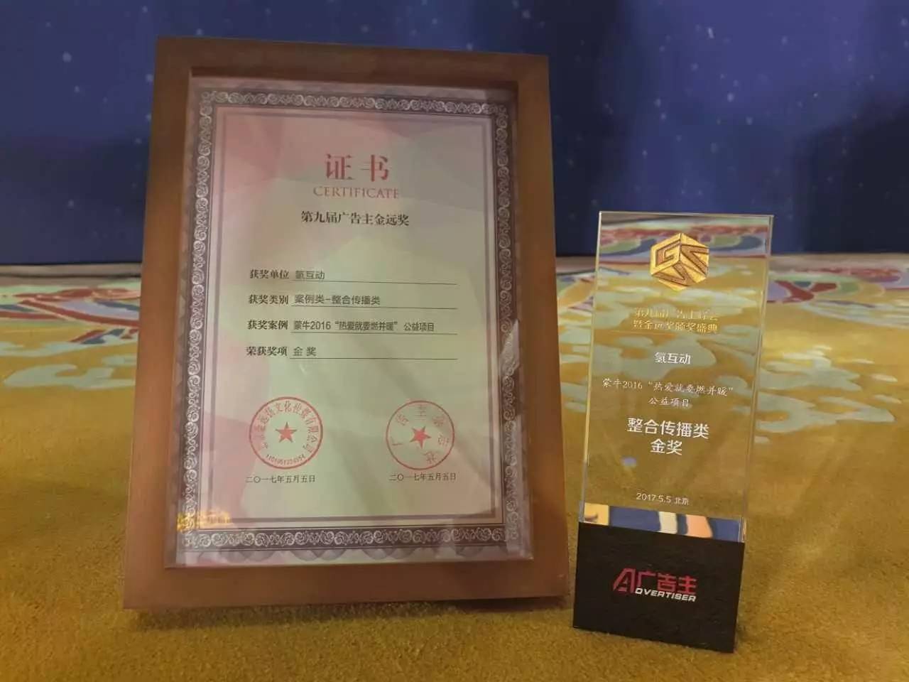 2017年5月5日,《跌變2017·第九屆中國(guó)廣告主峰會(huì)暨金遠(yuǎn)獎(jiǎng)?lì)C獎(jiǎng)盛典》在北京舉行。蒙牛阿憑借“熱愛(ài)就要燃并暖”項(xiàng)目獲得公益項(xiàng)目整合傳播類金獎(jiǎng)。