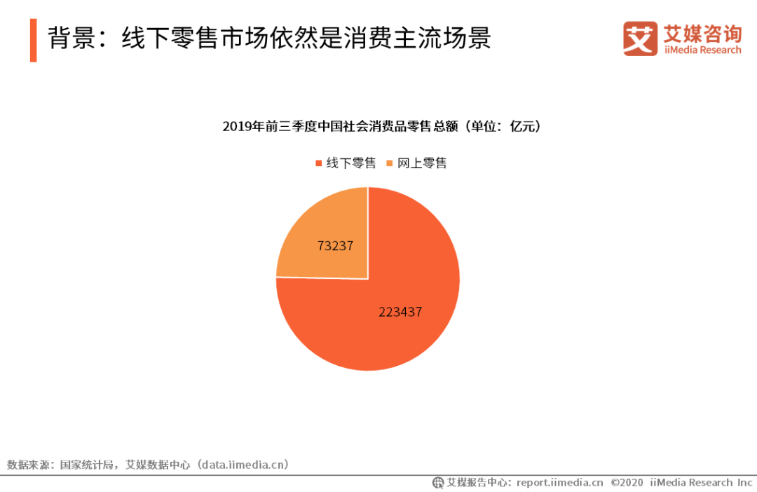 背景:線下零售市場依然是消費主流場景 國家統計局數據顯示,2019年前三季度,全國實現社會消費品零售總額296674億元。其中,網上零售額73237億元,線下零售額223437億元,線下零售占比達75.3%。 艾媒咨詢分析師認為,線下零售仍然是國內大眾消費的主要方式。而商圈作為線下零售的重要場景,隨著新零售的進一步發展,商圈價值潛力有望得到進一步挖掘。