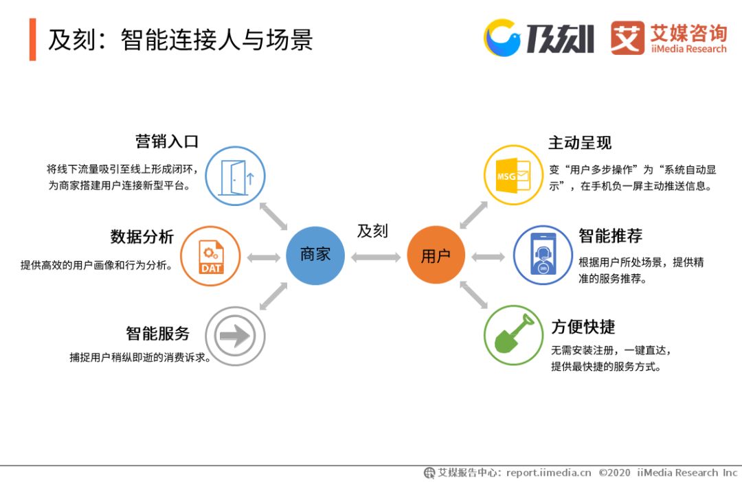 及刻:智能連接人與場景 及刻實現了手機用戶與線下場景的即時連接,在為用戶提供智能、便捷服務的同時,也為商家提供了觸達用戶的渠道。艾媒咨詢分析師認為,及刻具有交互至簡、使用輕便等特點,在智慧場景服務整合及分發方面具有獨到優勢。