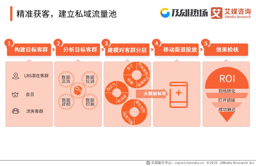 精準獲客,建立私域流量池 基于線下消費場景, 通過WiFi、藍牙、地磁等精準定位方式,結合深度學習和神經網絡算法,可即時感知近場客群,根據客群線上及線下消費偏好洞察,對其進行分層,進而有針對性地通過不同的廣告投放渠道,向其精準推薦可能需要的商品及服務,最終提升ROI(轉化率)。 商家可以借客群精準觸達,將其轉化為會員,從而建立私域流量池。