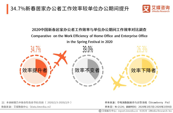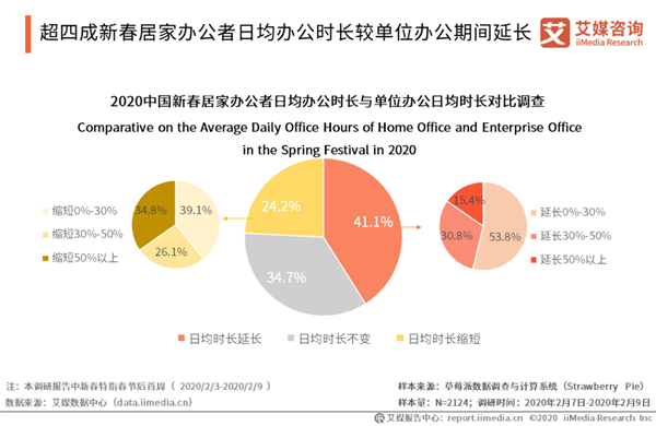 34.7%新春居家辦公者工作效率較單位辦公期間提升 iiMedia Research(艾媒咨詢)數據顯示,在辦公效率方面,34.7%的新春居家辦公者認為其效率較單位工作期間有所提升,39.0%受訪者表示居家辦公與單位辦公效率無差,26.3%的受訪者透露其居家辦公效率較單位辦公期間下降。艾媒咨詢分析師認為,結合受訪者日均工作時長來看,居家辦公效率提升者當中有62.8%的受訪者日均工作時長延長,意味著受訪者居家辦公的單位時間工作效率有可能下降。
