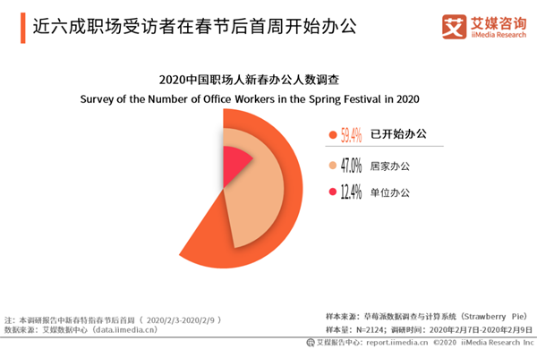 近六成職場受訪者在春節后首周開始辦公 iiMedia Research(艾媒咨詢)數據顯示,盡管僅有26.3%的受訪職場者表示其所在企業于2月10日前復工,但在2月10日前開始辦公的受訪職場者占比達59.4%。艾媒咨詢分析師認為,多數企業在節假日期間也會安排少量人員處于在崗狀態,是造成以上兩個數據差異的主要原因。在開始辦公的受訪者中,采取居家辦公的占47.0%,回單位辦公的占12.4%。