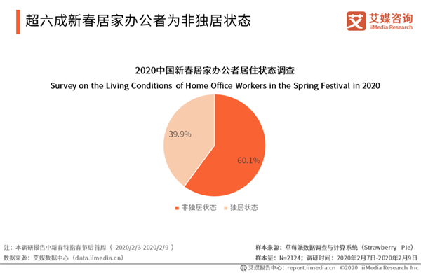 超六成新春居家辦公者為非獨居狀態 iiMedia Research(艾媒咨詢)數據顯示,2020年2月3日至2月9日,居家辦公的受訪者中有60.1%處于非獨居狀態,39.9%為獨居狀態。艾媒咨詢分析師認為,居家辦公并非中國主流辦公模式,多數職場人尚未養成居家辦公的習慣,尤其在非獨居狀態下,受到干擾的可能性較大,對工作效率會造成一定影響。