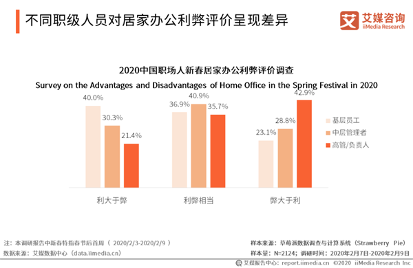 不同職級人員對居家辦公利弊評價呈現差異 iiMedia Research(艾媒咨詢)數據顯示,40.0%受訪基層員工認為居家辦公利大于弊,40.9%受訪中層管理者認為居家辦公利弊相當,42.9%受訪高管/負責人認為居家辦公弊大于利。艾媒咨詢分析師認為,各方利益不盡相同,是導致不同職級人員對居家辦公利弊評價存在差異的主要原因。多數高管/負責人出于對員工個人效率、相互協作效率及公司商業機密等多種因素的顧慮,更傾向認為居家辦公弊大于利。