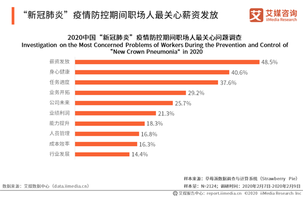 “新冠肺炎”疫情防控期間職場人最關心薪資發放 iiMedia Research(艾媒咨詢)數據顯示,在“新冠肺炎”疫情防控期間,受訪職場人較為關注的三個問題分別是薪資發放、身心健康、任務進度,占比分別為48.5%、40.6%、37.6%。