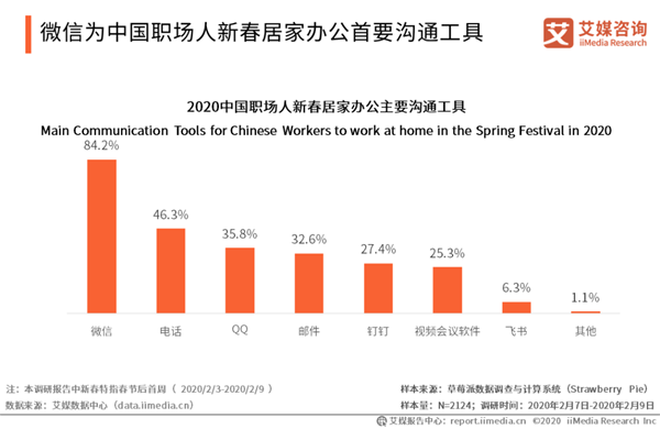 微信為中國職場人新春居家辦公首要溝通工具 iiMedia Research(艾媒咨詢)數據顯示,中國職場人新春居家辦公期間使用的溝通工具,排在前三位的分別是微信、電話、QQ,占比分別為84.2%、46.3%、35.8%。艾媒咨詢分析師認為,微信覆蓋人群廣、用戶習慣使用等特點是其成為首要溝通工具的主要原因。