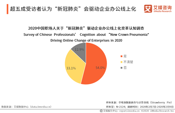 超五成受訪者認為“新冠肺炎”會驅動企業辦公線上化 iiMedia Research(艾媒咨詢)數據顯示,54.0%的受訪職場人認為“新冠肺炎”會驅動企業辦公線上化發展,僅12.9%的受訪職場人持相反態度。艾媒咨詢分析師認為,“新冠肺炎”防控期間,大量企業采取線上辦公,為教育和培養大眾線上辦公創造了良好契機,但企業線上辦公常態化還有賴于線上辦公軟件市場的成熟發展,從當前情況來看,企業線上辦公道阻且長。