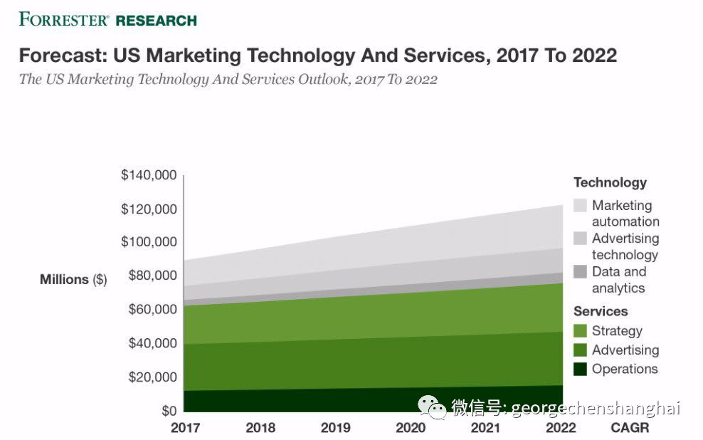 在企業數字化轉型實踐中,發現潛在的以及已有的顧客(消費者),跟TA們建立溝通關系,用精準的、個性化的方式進行互動,從而提高營銷轉化效率,提升顧客忠誠度,這些屬于“數字化營銷”轉型的領域。對于這個領域,有些企業有一些其他叫法,例如“數字化顧客運營”、“用戶大數據平臺”等等,其內容實質或多或少都屬于數字化營銷的范疇。 當前,不少中國企業的管理者在推動數字化營銷轉型時,存在著不少誤區,其中最典型的認識是: 將數字化營銷看成是IT系統實施項目 希望尋找“全能”的數字化營銷平臺以及系統集成供應商 建立數字化營銷的業務流程體系 對這些認識,觀點是: 1, 數字化營銷歸CMO還是CIO管 IT在企業中的應用,從“信息化”向“數字化轉型”變化以來,傳統IT治理模式受到很大挑戰,CIO的“傳統邊界”逐漸被業務主管侵蝕:基礎設施(企業私有云和多云管理、數字化和數據平臺)、網絡安全以及傳統核心應用系統(例如ERP)等仍屬于CIO范疇,然而,越來越多的業務部門已經走到了信息技術應用的前臺;業務和IT的關系,不再是“需求提出方”和“需求滿足方”的關系。 根據Forrester 在2018年的一項研究(下圖),在美國,數字化營銷相關的支出已經占到企業營銷支出的30%以上,其中營銷技術方面支出對總數字化營銷支出占比,將從目前不到30%在未來五年增長到39%。