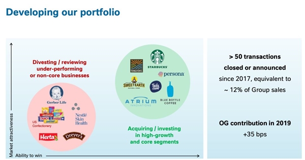 談收購(gòu) 而在談到雀巢組合管理時(shí),施奈德表示,過(guò)去一年進(jìn)行了很多業(yè)務(wù)剝離,而他的遺憾是收購(gòu)力度并沒(méi)有同樣的大,并希望這種情況可以在2020年得到改變。 自2017年施奈德接任雀巢CEO職位后,已經(jīng)完成或宣布的交易多達(dá)50多項(xiàng),約占集團(tuán)銷(xiāo)售額的12%,這已經(jīng)超出了2017年所給出大約10%的預(yù)期。 “我相信2020年將是收購(gòu)和出售更為平衡的一年。而對(duì)于管理產(chǎn)品組合管理而言,這仍將是繁忙的一年。從現(xiàn)在看這一點(diǎn)都已經(jīng)非常明顯了。”施奈德昨日說(shuō)。 他認(rèn)為雀巢會(huì)投資給增長(zhǎng)更快、利潤(rùn)率更高、更契合行業(yè)趨勢(shì)、更能滿足更年輕及消費(fèi)水平更高的群體,以及更高端的產(chǎn)品。此外,它們還更好地利用了數(shù)字化機(jī)遇來(lái)進(jìn)行個(gè)性化定制。