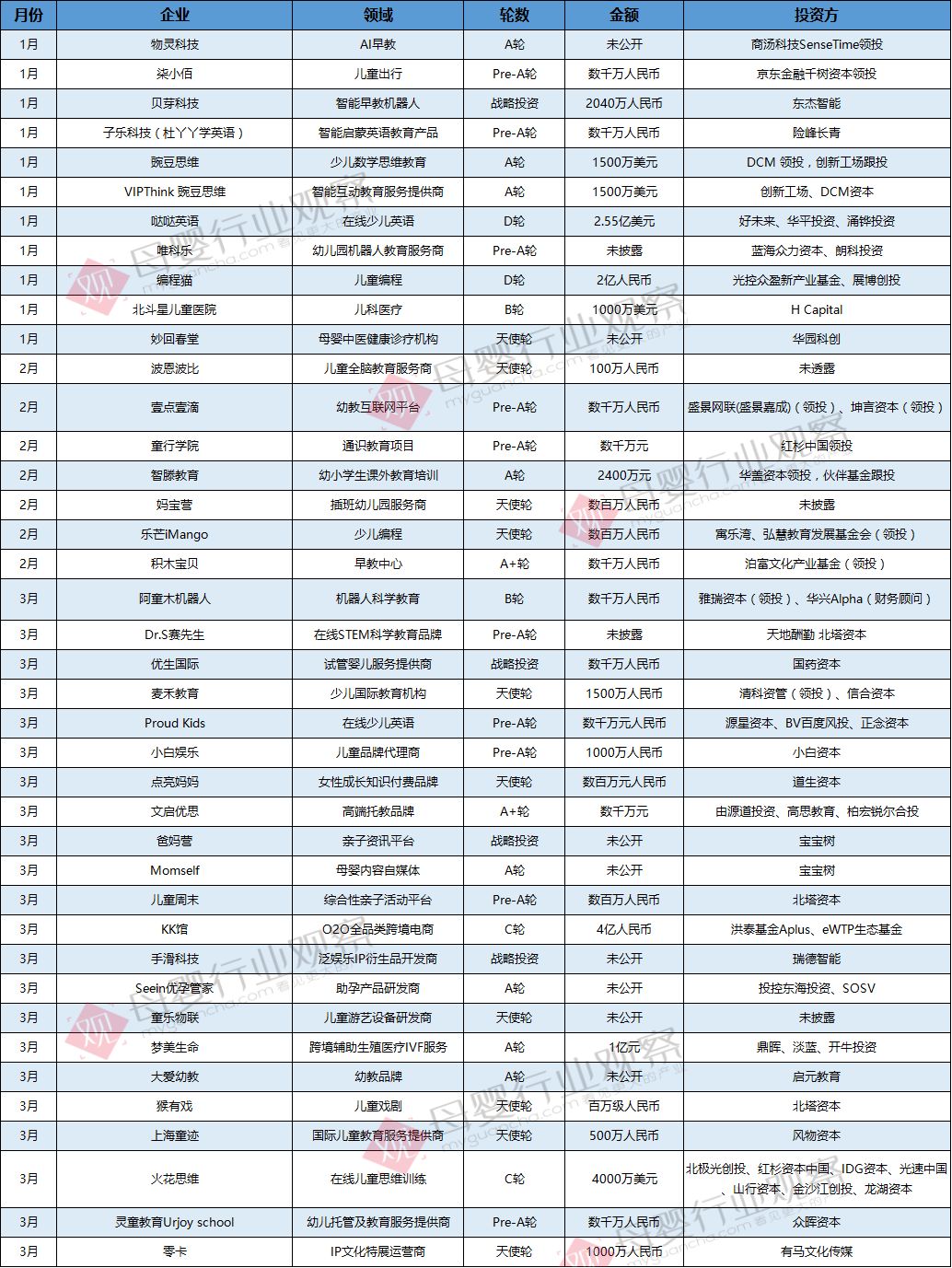 其中,母嬰產品消費市場方面,2019年飛鶴港股上市,君樂寶“單飛”加速沖擊IPO,蒙牛70億收購貝拉米,都成為國產奶粉發展過程中的標志性事件。此外,母嬰細分市場爆發,如嬰兒喂養、玩具益智、孕產婦相關等消費大漲,消費升級加速推動母嬰產品迭代與服務升級,細分領域跑出更多黑馬,如babycare在2019年8月就被爆料以30億的估值獲紅杉資本3億投資,占股10%。此外,兒童智能早教產品被資本熱捧,牛聽聽、物靈科技luka繪本閱讀機器人、杜丫丫早教機等均獲千萬級融資。 母嬰服務市場投融資方面,2019年線下親子樂園、孕產服務等共有8家企業獲得融資,投融資金額超10億。出生率下降的背景下,做好存量市場,深挖單客經濟,是母嬰企業最重要的戰場,服務成為非常重要的一環。從消費端來看,對于追逐服務品質的母嬰高凈值人群而言,價格不是最關鍵的,服務產品是否能真正滿足用戶需求才是最重要的,雖然資本寒冬對母嬰行業有影響,但是在這種理性的環境下優質企業更受歡迎。 疫情陰影籠罩之下,母嬰各行各業都有所受損,相信疫情帶來的短期波動不會影響一家優秀企業的長期價值,經歷過逆境中千錘百煉的公司,更具投資價值! 附全年投融資數據
