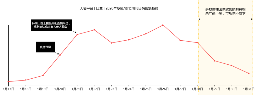 研究平臺(tái):天貓。研究時(shí)間:2020年除夕當(dāng)周(2020.1.24-1.30)與前一周(2020.1.17-1.23)的環(huán)比變化,對(duì)比2019年除夕兩周變化。疫情升溫日期以2020年1月20日作為起算之日。(數(shù)據(jù)統(tǒng)計(jì)日期截止到1月31日) 隨著疫情升溫,在疫情就是命令的嚴(yán)峻情況下,今年的春節(jié)很不一樣。消費(fèi)者心理預(yù)期產(chǎn)生變化,具體在消費(fèi)行為有了哪些轉(zhuǎn)變?且看數(shù)據(jù)威對(duì)比春節(jié)近兩周銷售趨勢(shì)的觀察。 抗疫防護(hù)產(chǎn)品 以口罩、護(hù)目鏡、防護(hù)服為代表的自我防護(hù)類目,銷售額爆量增長(zhǎng),抗疫期間一罩難求的困境也是目前供需市場(chǎng)里面最迫切待解的問題。