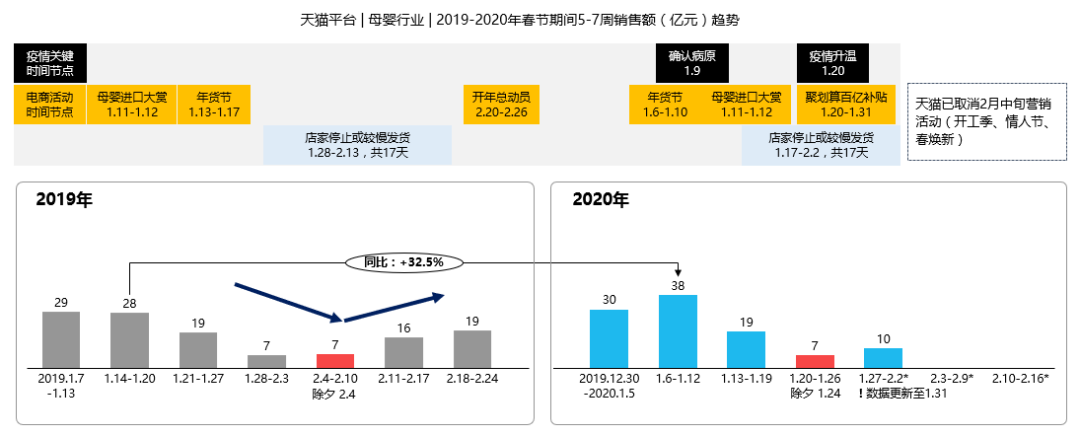 此外,品牌方還需進(jìn)一步思考挑戰(zhàn)及機(jī)遇。可預(yù)見在接下來的供應(yīng)鏈會(huì)面臨到兩大挑戰(zhàn): 1、量產(chǎn)不足:受開工延后及物流運(yùn)輸受阻,原材料供應(yīng)不足,上半年將面臨短暫量產(chǎn)不足的情況; 2、訂單減少:受交通管制、封路封城影響,非剛性需求延后;延遲復(fù)工、無法上門提供送裝服務(wù)等客觀因素,安裝類產(chǎn)品受限。 如何合理調(diào)配既有資源來應(yīng)對(duì)困境,取得突破是品牌方當(dāng)務(wù)之急。 疫情下非直接相關(guān)的快速消費(fèi)品市場(chǎng)表現(xiàn)又是如何? 食品、母嬰行業(yè):2020年年貨節(jié)發(fā)生在疫情升溫前,整體食品行業(yè)保持高速雙位數(shù)增長(zhǎng)。今年天貓聚劃算百億補(bǔ)貼活動(dòng)帶動(dòng)除夕當(dāng)周銷售提升,除夕后一周目前業(yè)績(jī)持平;同時(shí)間因受物流限制,疫情升溫后對(duì)于整體食品保健行業(yè)趨勢(shì)影響暫時(shí)還無法判定。目前已知2月中旬既有營(yíng)銷活動(dòng)取消,可預(yù)見短期或受較大沖擊。