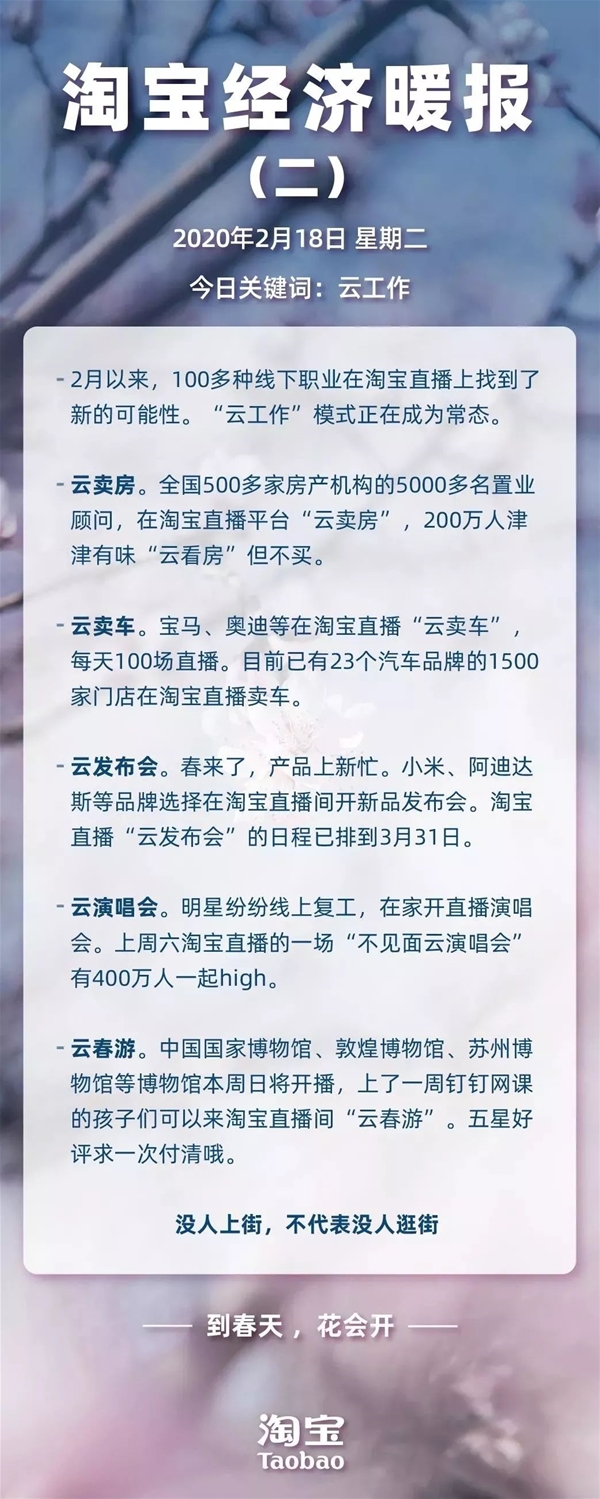 其中,淘寶直播在這次疫情寒冬之中,創新了很多玩法,給線下很多職業提供了新的上班方式。如導購直播賣貨、云賣房、云賣車、云發布會、云演唱會等等,在諸多企業停業,損失慘重之際,淘寶直播提供了新的解決方案。 1、疫情寒冬,淘寶直播卻一路狂奔 2019年,一句話術“買它、買它、買它”,讓李佳琦徹底火了,也給整個淘寶直播生態起到了帶動作用和口碑效應,讓更多的賣家參與到直播中來,從而為淘寶直播創造更高的業績。 不過,直播中最火的還是美妝、零售、衣服等產品,而一些需要依靠線下場景的行業,基本沒怎么涉及到直播。如今,疫情爆發,全民宅家,一些創新玩法,讓我們看到了淘寶直播的更多可能。 云賣房:200萬人圍觀 從1月到2月,短短39天時間,有95家房企破產。疫情給房地產行業帶來了巨大的損失,沒有資金回流,銀行貸款、員工等等高昂成本,壓垮了一些中小房企。
