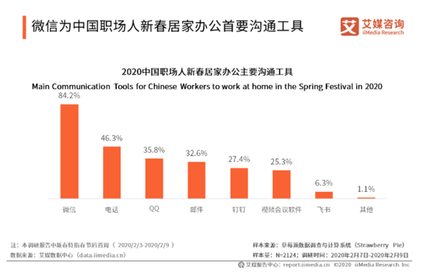 疫情過后 需求將大幅回落 總體來看,當前企業面臨著愈發嚴峻的競爭環境,人力成本持續走高;而企業追求的是效率提升和成本降低,在線辦公從一定程度上能有效緩解企業的需求。 中國遠程辦公普及率相對較低,企業協作仍為藍海市場,面臨著較大發展機會。隨著華為、騰訊等互聯網巨頭布局遠程辦公產品,遠程視訊、文檔協作等垂直細分領域繼續深耕,企業協作市場規模將進一步擴大,未來仍有較大發展空間。 但是,我們也需要清楚地意識到,此次在家辦公為偶發性事件,這屬于遠程辦公被動出圈,是廣大企業和員工在疫情影響下的無奈之舉,并非是市場進化的表現。對于大多數的行業來說,雖然可以在線上溝通、協作等,但最終很多合作和交易都得在線下完成,這是遠程辦公軟件無法去改變的事實。 相較于成熟的海外市場,國內的遠程辦公顯得有些青澀。突如其來的疫情短期內釋放了大量在線辦公軟件需求,產生了巨大的推動力,使勁推著遠程辦公行業往前狂奔。但各類在線辦公軟件存在的弊端難以快速改善,進而制約用戶粘性的提升。預計疫情防控期過后,在線辦公軟件需求將會大幅回落。 另外值得一提的是,從我們最近的調查來看,職場人新春居家辦公期間使用的溝通工具,排在前三位的分別是微信、電話、QQ,占比分別為84.2%、46.3%、35.8%。釘釘、飛書等這些辦公軟件排在其后,用戶的習慣尚未養成。
