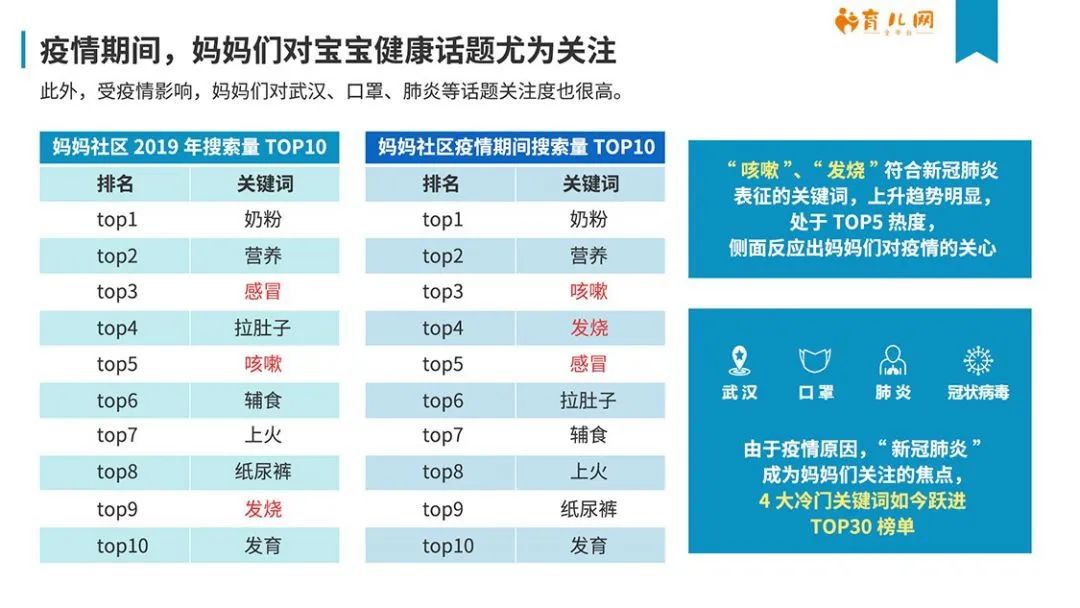 從健康類話題參與度上,也能看出媽媽們對于疫情的關注度:“武漢”、“口罩”、“肺炎”、“冠狀病毒”由冷門迅速成為熱搜焦點,“咳嗽”、“發燒”、“感冒”等新冠肺炎表征關鍵詞上升趨勢明顯,處于媽媽社區APP Top5熱度。