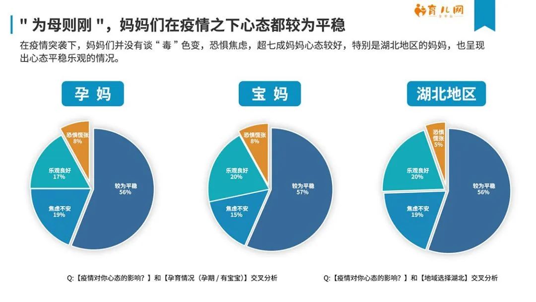 不過,略有意外的是,在接受調研的母嬰人群中,超7成媽媽在疫情期間心態良好,普遍未出現談“毒”色變的焦慮。受訪人群中17%的準媽媽和20%的寶媽心態樂觀良好,較為平穩的兩個人群都達到56%及以上。尤為重要的是,此次疫情的中心,湖北地區受訪人群的心態也較為平穩,“樂觀良好”和“較為平穩“的人群占比基本與其他地區一致。