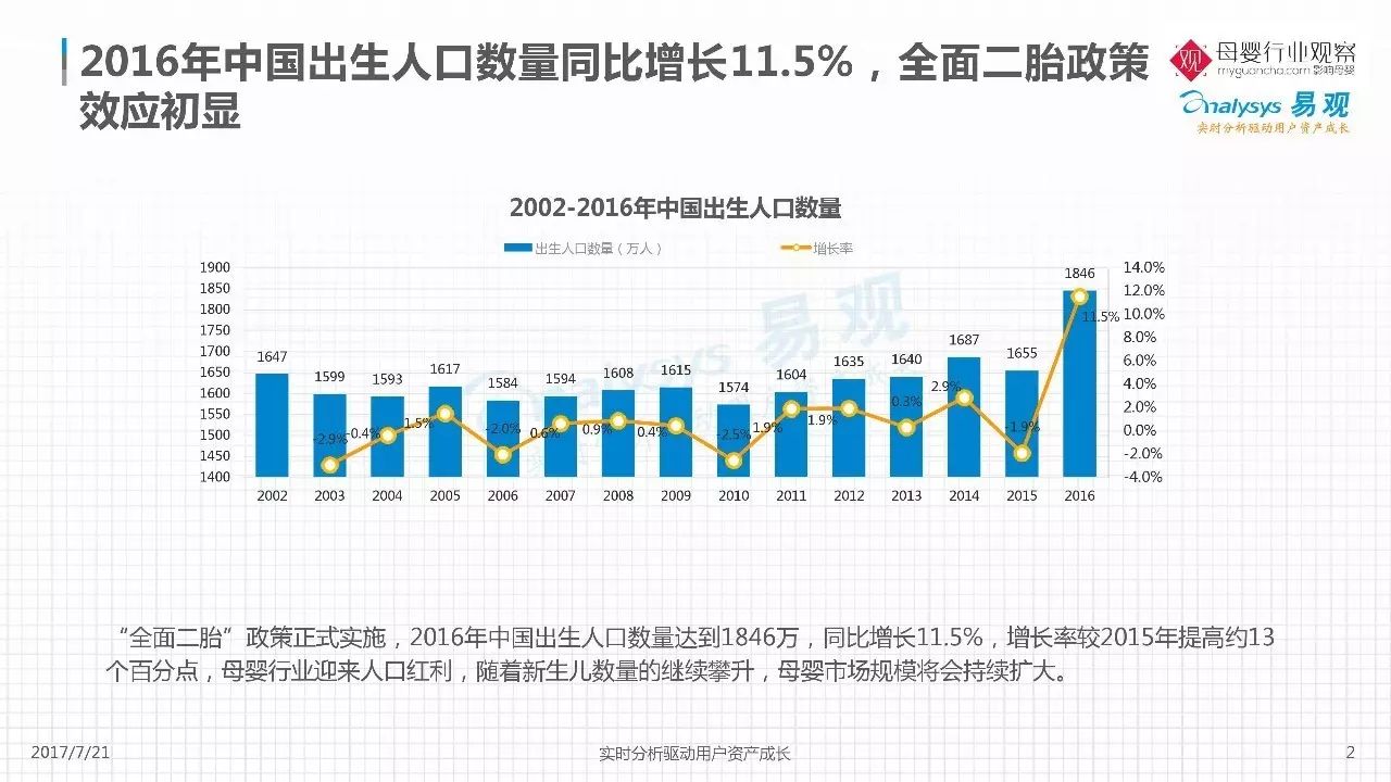 二孩政策效應(yīng)釋放,母嬰市場規(guī)模持續(xù)攀升,母嬰人群需求如何更好的被滿足?萬億母嬰市場,企業(yè)如何抓住機會?大數(shù)據(jù)帶你解讀母嬰人群和、市場現(xiàn)狀及企業(yè)布局重點。 互聯(lián)網(wǎng)母嬰市場現(xiàn)狀及發(fā)展方向 1、人口紅利