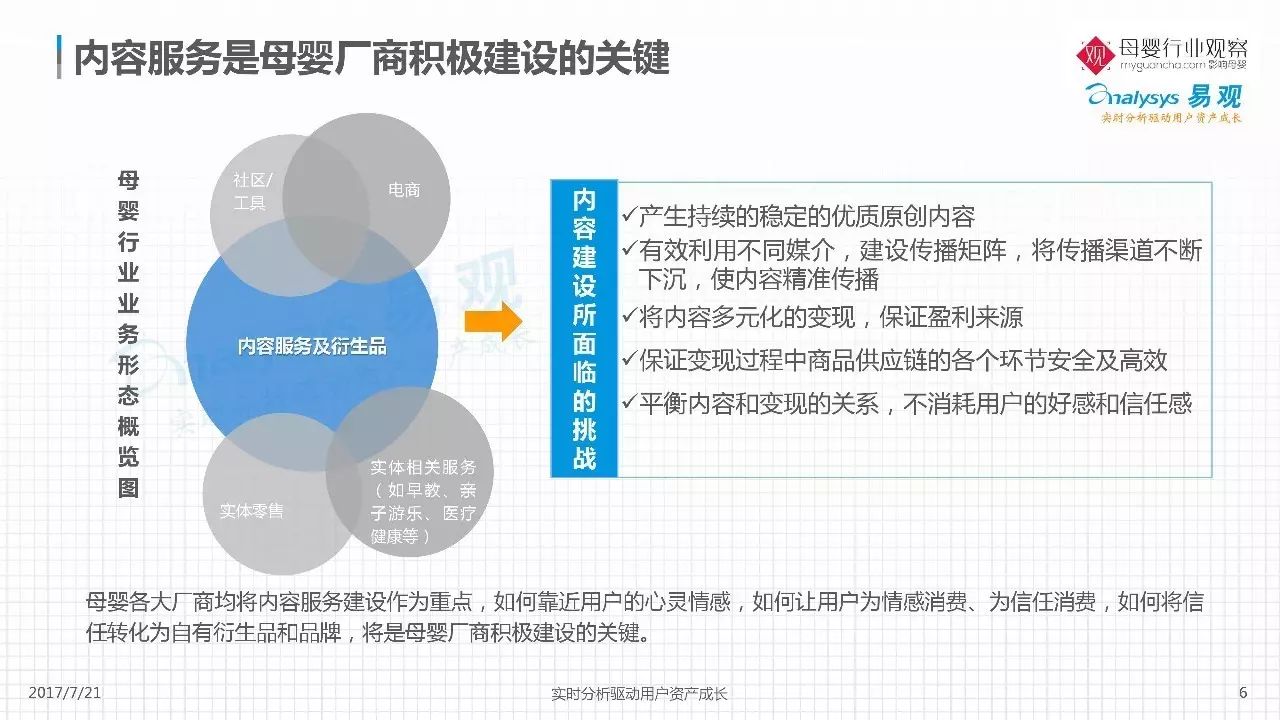 我們對整個產(chǎn)業(yè)鏈進行了梳理,母嬰產(chǎn)業(yè)鏈現(xiàn)在是一個融合整合的過程,不管是從品牌、渠道還是線下服務(wù),包括社區(qū)以及工具,各個環(huán)節(jié)都在進行融合發(fā)展。線上線下的結(jié)合包括在商業(yè)變現(xiàn)上做了很多的探索,未來我們認(rèn)為基于寶寶這一個點往更深的比如家庭消費這塊包括孩子的教育,甚醫(yī)療娛樂,都可能成為非常龐大的需求點,值得大家關(guān)注。 5、內(nèi)容服務(wù),信任是關(guān)鍵
