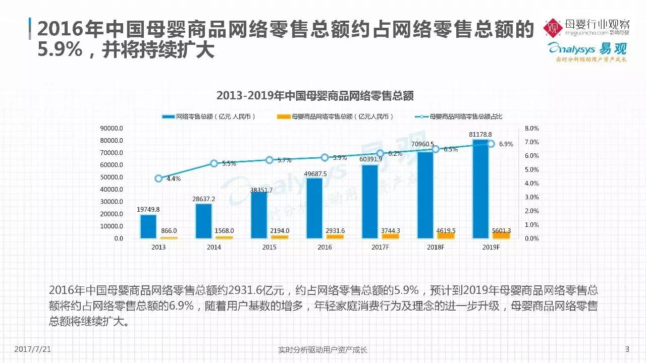 在二胎政策的開放下,2016年出生人口數(shù)量同比增長了11.5%,母嬰行業(yè)迎來了它的第二次人口紅利,整個行業(yè)隨著新生兒數(shù)量的攀升,市場規(guī)模也在持續(xù)擴大。 2、母嬰網(wǎng)絡(luò)零售份額