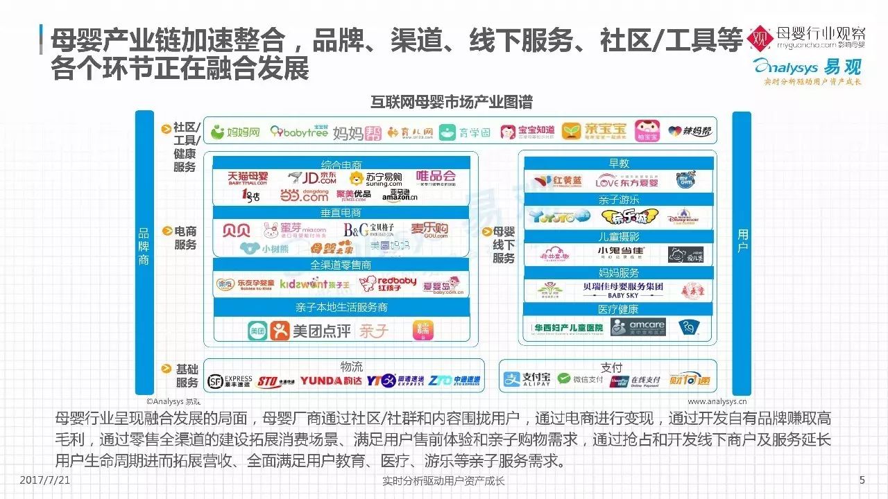 上圖對整個互聯(lián)網(wǎng)母嬰市場做了AMC的展現(xiàn),從1999年互聯(lián)網(wǎng)母嬰市場的第一家企業(yè)成立,一直到2019年整個行業(yè)未來的發(fā)展,我們把一些非常關(guān)鍵的節(jié)點做了標(biāo)注,現(xiàn)在行業(yè)處于高速發(fā)展期,而且廠商之間的商業(yè)模式越來越完善了,主體市場格局基本上已經(jīng)確定了。 4、母嬰產(chǎn)業(yè)鏈加速融合