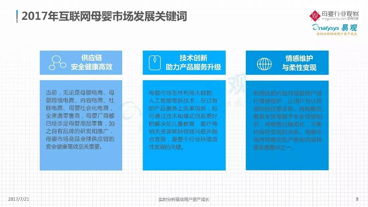 大部分母嬰廠商都是基于社群,母嬰社群帶來的經(jīng)濟效益是非常顯著的,而且用戶從最開始的消費者到最后角色會發(fā)生轉(zhuǎn)變,很多廠商的一把手當(dāng)初是從一個媽媽變成一個網(wǎng)紅之后開始進入這個行業(yè)去創(chuàng)業(yè)。在這個過程當(dāng)中社交是必不可少的,基于社交內(nèi)容的承載、人際關(guān)系的傳播也都是非常重要的。 7、互聯(lián)網(wǎng)母嬰市場發(fā)展的三個方向