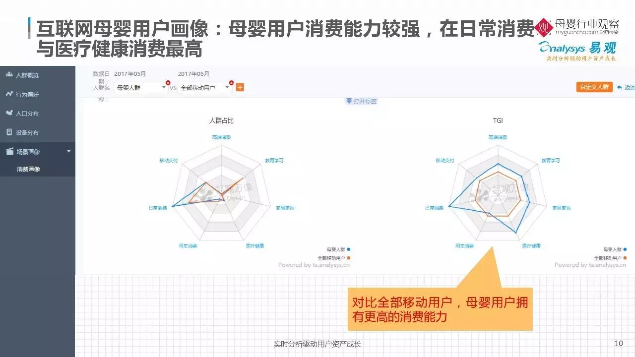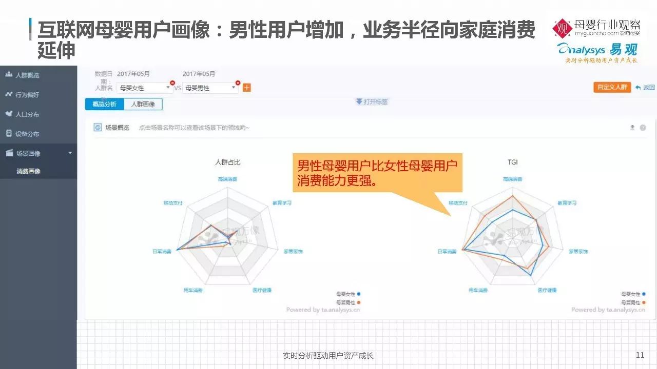 上圖分別是整個移動互聯(lián)網(wǎng)用戶在消費上的對比和母嬰人群在消費上的對比。大家可以清晰地看到,母嬰用戶的消費能力是非常強的,而且在日常醫(yī)療健康上相對于整個全網(wǎng)用戶來說也擁有非常高的消費能力,所以未來醫(yī)療消費在母嬰行業(yè)一定是可延展的。 3、母嬰消費向家庭消費延伸