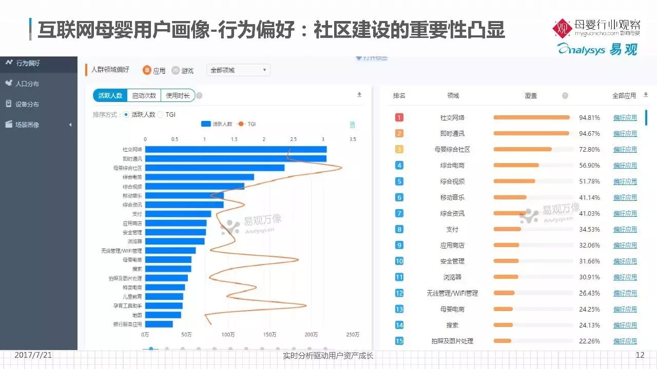 最后一張圖,給大家展現(xiàn)的是整個母嬰用戶畫像里面用戶的行為偏好,再一次印證了我們前面所提到社交的重要性。我們對于全網(wǎng)用戶做過一個比較,發(fā)現(xiàn)母嬰用戶在社交上的指數(shù)是高于很多行業(yè)的,很多父母都有曬娃或者曬孩子成長經(jīng)歷的情感上的訴求,希望在這些母嬰平臺上尋找到更多的共鳴和話題,所以整個母嬰行業(yè)社交性是非常凸顯的。社交是母嬰行業(yè)必不可少的一個環(huán)節(jié),這塊廠商要基于高質(zhì)量的內(nèi)容、有誠信的內(nèi)容,不斷地提升平臺在社交上的價值。 |