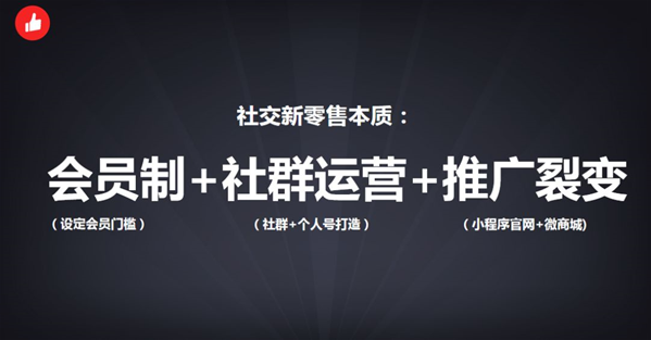 社交新零售本質是會員制+社群運營+推廣裂變 流量是一切生意的本質。如果你有門店一定要讓客戶花低成本的價格,讓他到店來體驗,建立信任交易,成為自家魚塘后,可關注小程序、公眾號等,留存到線上之后,再幫你傳播裂變。此外,微信生態絕對是布局私域流量很重要的載體,未來幾年它也是最好的。現在微信小程序月活躍達到了3億,整個微信的月活有11億,這些巨大的流量,就是我們可以做事情的一些來源,因為有流量的地方就有商機。 以前我們做生意只關注客量、轉化率、客單價這三個詞,但現在運營的過程當中發生了巨大的變化,在于我們有沒有把用戶當做流量來重點運營轉化率的事情,有沒有把你的客戶當做一個真正的人,然后挖掘這個人背后可以給你帶來的更多價值。所以有門店的老板要記得,你的導購跟你的消費者之間建立的這種社交關系鏈越好,生意就越好,未來絕對是這樣的過程。 社交新零售本質是會員制+社群運營+推廣裂變。首先讓消費者成為我們的會員或者粉絲,然后是社群運營,微信絕對是最好的生態,其中微信好友數超過5000的個人號已達到180萬,現在微信好友的數量已經快突破5000了,通過掃碼進群的人數從原來的100人升級成現在的200人了。微信雖然不在個人號上面做一些鼓勵的動作,但它在技術和真正的功能上面為大家開辟了更多的可能。最后是推廣裂變,承載的工具可以是小程序、微商城等。