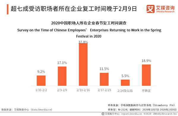 超七成受訪職場者所在企業(yè)復(fù)工時間晚于2月9日 iiMedia Research(艾媒咨詢)數(shù)據(jù)顯示,26.3%的受訪職場者表示其所在企業(yè)在2月10日前已經(jīng)復(fù)工,其中2月3日前復(fù)工的受訪職場者占9.2%;73.7%的受訪職場者表示其所在企業(yè)復(fù)工時間晚于2月9日。