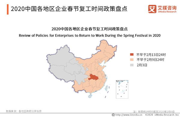 超七成受訪職場者所在企業(yè)仍未復(fù)工,已復(fù)工者主要集中在互聯(lián)網(wǎng)相關(guān)行業(yè) 26.3%的受訪職場者表示其所在企業(yè)在2月10日前已經(jīng)復(fù)工,其中2月3日前復(fù)工的受訪職場者占9.2%;36.5%的已復(fù)工受訪者集中在互聯(lián)網(wǎng)/電子商務(wù)/IT/通訊行業(yè)。 超四成新春居家辦公者辦公時間延長,超三成新春居家辦公者認(rèn)為工作效率有所提升 41.1%的居家辦公受訪者日均辦公時長延長,居家辦公日均時長縮短的受訪者占24.2%;34.7%的新春居家辦公者認(rèn)為自身工作效率提升,26.3%的受訪者透露其居家辦公效率下降。 不同職級人員對居家辦公利弊評價呈現(xiàn)差異 40.0%受訪基層員工認(rèn)為居家辦公利大于弊,40.9%受訪中層管理者認(rèn)為居家辦公利弊相當(dāng),42.9%受訪高管/負(fù)責(zé)人認(rèn)為居家辦公弊大于利。 “新冠肺炎”防控期間職場人最關(guān)心薪資發(fā)放,近六成受訪者認(rèn)為所在企業(yè)業(yè)績會受拖累 “新冠肺炎”防控期間,薪資發(fā)放為職場人最關(guān)心問題,占比達(dá)48.5%;59.4%的受訪職場人認(rèn)為“新冠肺炎”會導(dǎo)致其所在企業(yè)第一季度業(yè)績下滑。 以下為報告節(jié)選內(nèi)容 2020中國各地區(qū)企業(yè)春節(jié)復(fù)工時間政策盤點(diǎn) 2020年春節(jié)期間,為防控新型冠狀病毒感染肺炎疫情,中國國務(wù)院于1月27日發(fā)布通知,將春節(jié)假期延長至2月2日。后因疫情發(fā)展迅速,多地政府陸續(xù)發(fā)布延遲企業(yè)復(fù)工政策文件,其中超20個省份要求企業(yè)復(fù)工時間不早于2月9日24時。