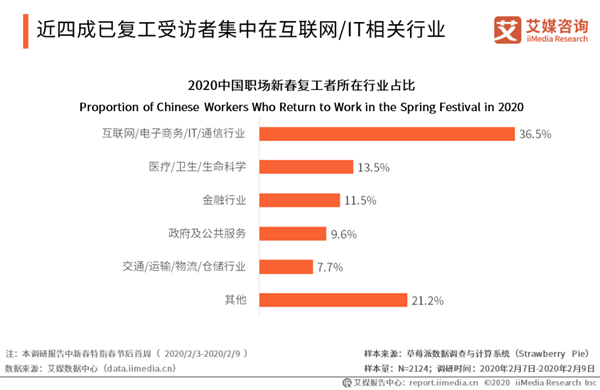近四成已復(fù)工受訪者集中在互聯(lián)網(wǎng)/IT相關(guān)行業(yè) iiMedia Research(艾媒咨詢)數(shù)據(jù)顯示,互聯(lián)網(wǎng)/電子商務(wù)/IT/通訊行業(yè)、醫(yī)療/衛(wèi)生/生命科學(xué)、金融行業(yè)為已復(fù)工受訪者人數(shù)最多的三大領(lǐng)域,占比分別為36.5%、13.5%、11.5%。