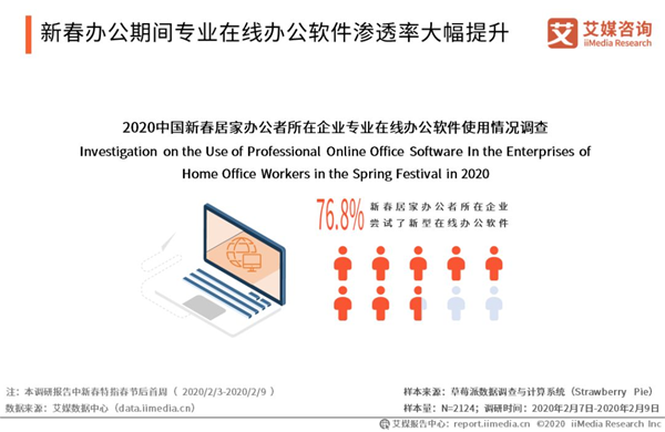 新春辦公期間專業(yè)在線辦公軟件滲透率大幅提升 iiMedia Research(艾媒咨詢)數(shù)據(jù)顯示,76.8%的新春居家辦公者表示其所在企業(yè)在此期間嘗試了新型的在線辦公軟件(如考勤簽到、會議溝通、項(xiàng)目管理/協(xié)助、在線審批等)。艾媒咨詢分析師認(rèn)為,此次新春居家辦公為偶發(fā)性事件,雖然推動了專業(yè)在線辦公軟件的滲透,但由于多數(shù)在線辦公軟件功能較為單一,未來能否成為企業(yè)長期使用的工具還有待進(jìn)一步觀察。
