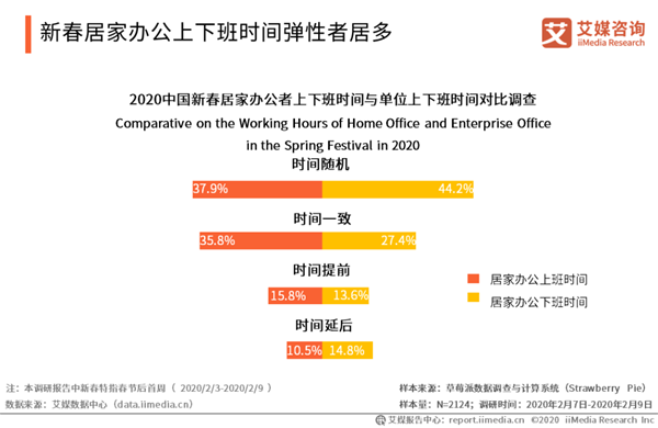 新春居家辦公上下班時間彈性者居多 iiMedia Research(艾媒咨詢)數(shù)據(jù)顯示,與在單位辦公相比,多數(shù)居家辦公受訪者上、下班時間較為隨機(jī),占比分別為37.9%、44.2%;居家辦公與單位辦公上、下班時間保持一致的受訪者分別為35.8%、27.4%;此外分別有15.8%的居家辦公者上班時間提前,14.8%的居家辦公桌下班時間延后。