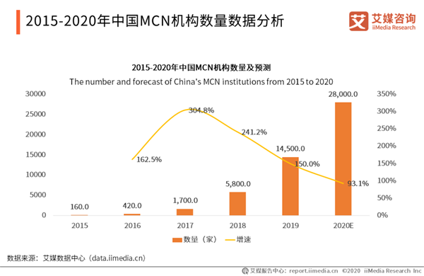 市場數(shù)據(jù)分析(節(jié)選): 2015-2020年中國MCN機構(gòu)數(shù)量數(shù)據(jù)分析 作為內(nèi)容產(chǎn)業(yè)的新興鏈路,中國MCN產(chǎn)業(yè)自2017年出現(xiàn)了爆發(fā)式增長,機構(gòu)數(shù)量從數(shù)百家量級猛漲到上萬家量級,平均同比增速大于100%。預(yù)計到2020年,中國MCN機構(gòu)數(shù)量將突破兩萬家,達到28000家。艾媒咨詢分析師認為,中國MCN機構(gòu)數(shù)量急劇增長,內(nèi)容產(chǎn)業(yè)入局者越來越多,行業(yè)競爭會更加激烈。