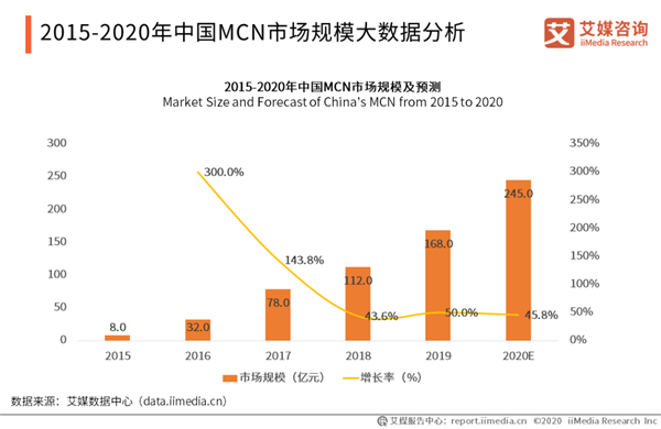 2015-2020年中國MCN市場規(guī)模大數(shù)據(jù)分析 自2016年起中國MCN市場規(guī)模迅速擴張,2018年市場規(guī)模達到百億級,在2019年的直播電商帶貨效益不斷展現(xiàn)后,預(yù)計到2020年中國MCN市場規(guī)模將進一步擴展,達到245.0億元。艾媒咨詢分析師認為,目前電商直播的變現(xiàn)效益正在逐步展現(xiàn),2020年MCN機構(gòu)將享受到行業(yè)紅利,但隨著資本入駐以及MCN機構(gòu)的不斷增加,行業(yè)競爭將更加激烈。