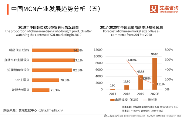 中國MCN產(chǎn)業(yè)發(fā)展趨勢分析(五) iiMedia Research(艾媒咨詢)數(shù)據(jù)顯示,明星或者網(wǎng)紅KOL帶貨轉(zhuǎn)化率都在75%以上,直播電商行業(yè)發(fā)展火爆,預(yù)計到2020年中國直播電商銷售規(guī)模將達9160億元,約占中國網(wǎng)絡(luò)零售規(guī)模8.7%。 艾媒咨詢分析師認為,直播電商主要是通過明星/網(wǎng)紅精準營銷帶貨從而獲取營利收入。相對于其他內(nèi)容形式來說,直播電商市場天花板更高、變現(xiàn)能力更強,將會成為MCN發(fā)展的一個重要方向。但值得注意的是,并不是所有的產(chǎn)品都具備直播性質(zhì),而有些沖動消費也不具有內(nèi)容解釋空間。