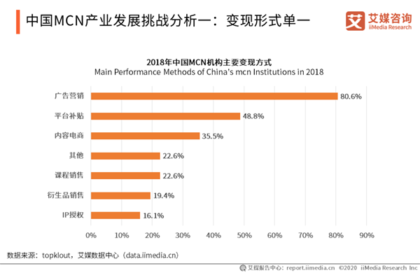行業(yè)趨勢分析(節(jié)選): 中國MCN產(chǎn)業(yè)發(fā)展挑戰(zhàn)分析一:變現(xiàn)形式單一 目前MCN機構(gòu)主要商業(yè)變現(xiàn)形式是廣告營銷和平臺補貼,廣告營收是大頭,主流變現(xiàn)形式單一。艾媒咨詢分析師認為,MCN機構(gòu)的商業(yè)價值很大程度上來說是分割了品牌商在互聯(lián)網(wǎng)的一部分投放資金,但品牌商廣告投放主陣地是在電視媒體,加上近年來電梯廣告的沖擊,互聯(lián)網(wǎng)投放廣告的比例并不樂觀。未來,多渠道探索商業(yè)變現(xiàn)形式是MCN發(fā)展的出路之一。