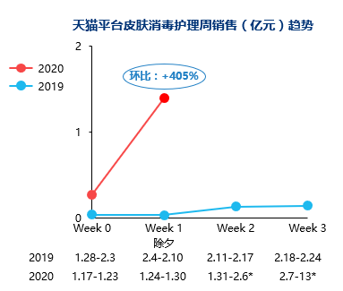 進(jìn)一步觀察分周銷售表現(xiàn),可看到在疫情升溫后,消費(fèi)者對(duì)于皮膚消毒護(hù)理產(chǎn)品(75%酒精噴霧劑、消毒液)需求提高,相似于防疫產(chǎn)品的供不應(yīng)求現(xiàn)象,消毒相關(guān)產(chǎn)品未來幾周的銷售趨勢仍待觀察。