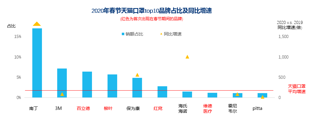 口罩頭部品牌表現(xiàn),南丁位居榜首,主要銷售嬰童口罩,且春節(jié)期間仍發(fā)貨成為品牌勝出的重要因素;百立德等4個(gè)國產(chǎn)品牌首次入榜春節(jié)檔,由于庫存?zhèn)湄泦栴}3M、霍尼韋爾、pitta增長則不及天貓整體;特殊時(shí)期防護(hù)用品統(tǒng)籌調(diào)配,未來品牌格局仍待觀察。