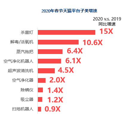 抗疫(帶殺菌消毒功能)的家用電器 此次疫情對(duì)消費(fèi)者的消費(fèi)心理帶來的影響,進(jìn)一步發(fā)現(xiàn)帶有“健康/殺菌/消毒屬性”的生活電器持續(xù)走熱,需求偏好進(jìn)一步加強(qiáng)。即便是傳統(tǒng)品類吸塵器、空氣凈化器、掃地機(jī)器人受品質(zhì)生活影響,依舊熱銷;蒸汽拖把、解毒/活氧機(jī)等新興品類有效解決疫情期間消毒需求,獲得快速發(fā)展。另外,在功能性燈具(殺菌燈)同樣迎來一波爆發(fā),值得留意。