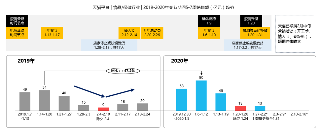 此外,品牌方還需進(jìn)一步思考挑戰(zhàn)及機(jī)遇。可預(yù)見在接下來的供應(yīng)鏈會(huì)面臨到兩大挑戰(zhàn): 1、量產(chǎn)不足:受開工延后及物流運(yùn)輸受阻,原材料供應(yīng)不足,上半年將面臨短暫量產(chǎn)不足的情況; 2、訂單減少:受交通管制、封路封城影響,非剛性需求延后;延遲復(fù)工、無法上門提供送裝服務(wù)等客觀因素,安裝類產(chǎn)品受限。 如何合理調(diào)配既有資源來應(yīng)對(duì)困境,取得突破是品牌方當(dāng)務(wù)之急。 疫情下非直接相關(guān)的快速消費(fèi)品市場表現(xiàn)又是如何? 食品、母嬰行業(yè):2020年年貨節(jié)發(fā)生在疫情升溫前,整體食品行業(yè)保持高速雙位數(shù)增長。今年天貓聚劃算百億補(bǔ)貼活動(dòng)帶動(dòng)除夕當(dāng)周銷售提升,除夕后一周目前業(yè)績持平;同時(shí)間因受物流限制,疫情升溫后對(duì)于整體食品保健行業(yè)趨勢影響暫時(shí)還無法判定。目前已知2月中旬既有營銷活動(dòng)取消,可預(yù)見短期或受較大沖擊。
