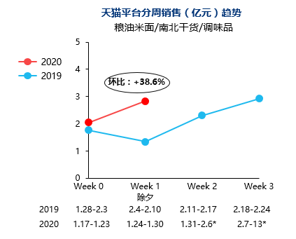 進(jìn)一步觀察多數(shù)細(xì)分子行業(yè)短期內(nèi)無明顯變化,僅食品行業(yè)下糧油米面/南北干貨/調(diào)味品下如方便速食(如:方便面、方便粉絲、即食火鍋、面條/掛面)、米/面粉(如:大米、面粉)帶動(dòng),此類產(chǎn)品本身具備方便性且可耐儲(chǔ)存,原本在春節(jié)期間銷售持平,此次或受疫情聯(lián)動(dòng)使得品類有明顯反彈。