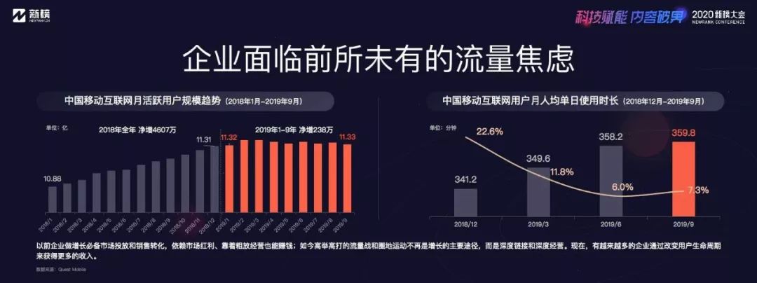 企業(yè)提出這些問題,是因?yàn)檎媾R前所未有的流量焦慮。剛做完跨年演講的羅振宇老師曾提出“國民總時(shí)間”的概念,網(wǎng)民的上網(wǎng)總時(shí)間取決于兩個(gè)因素,一是網(wǎng)民規(guī)模,二是人均上網(wǎng)時(shí)長。根據(jù)第三方數(shù)據(jù),中國移動互聯(lián)網(wǎng)的MAU,也就是月活躍用戶,2018年年初為10.88億,年底增長到11.31億,全年凈增4000多萬;而截至到2019年9月底的月活為11.33億,9個(gè)月只增長了200多萬。月人均單日使用時(shí)長,從2018年12月份的341分鐘增長到2019年9月份的359分鐘,但同比增長從22.6%下滑到7.3%。所以我們說,網(wǎng)民的上網(wǎng)總時(shí)間還在增長,但增速卻在大幅放緩。