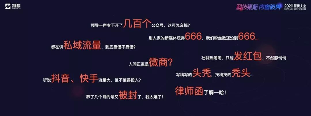 去年新榜大會,我們提出了兩個(gè)概念,全域營銷和私域運(yùn)營。過去的一年里,圍繞這兩個(gè)方向,我們做了很多嘗試,昨天維宇講了全域營銷,今天我主要就私域跟大家做個(gè)交流。 私域火了一整年,有人借助私域賺得盆滿缽滿,甚至誕生了上市公司;也有人投入巨大卻空手而歸,年終總結(jié)核心只有四個(gè)字:重在參與。 我們經(jīng)常被問到各種各樣的問題:集團(tuán)幾百個(gè)號,怎么運(yùn)營和管理?別人玩得666,我們粉絲數(shù)還不到666;私域流量就是微商嗎?社群就是發(fā)紅包嗎?抖音、快手要不要做?內(nèi)容生產(chǎn)能力不足怎么辦?版權(quán)怎么解決?