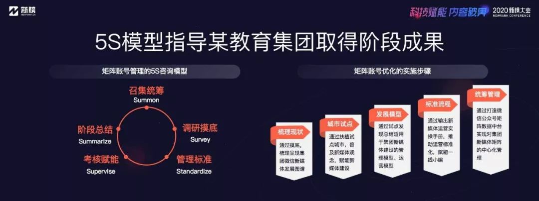 在這里,首先感謝不愿意透露姓名的客戶對我們的信任,在整整一年的時(shí)間里,和我們共度了一段不知終點(diǎn)的探索之旅。在新榜提出的5S原則指導(dǎo)下,我們協(xié)助某大型教育集團(tuán)對新媒體矩陣進(jìn)行了優(yōu)化提升,并取得了階段性成果。大致分為5個(gè)步驟,第1步通過調(diào)研摸底,梳理出集團(tuán)的新媒體發(fā)展圖譜;第2步在重點(diǎn)城市和學(xué)校進(jìn)行試點(diǎn);第3步通過試點(diǎn)總結(jié)出管理和運(yùn)營兩個(gè)模型;第4步形成SOP手冊;第5步打造開發(fā)了數(shù)據(jù)中臺系統(tǒng)。