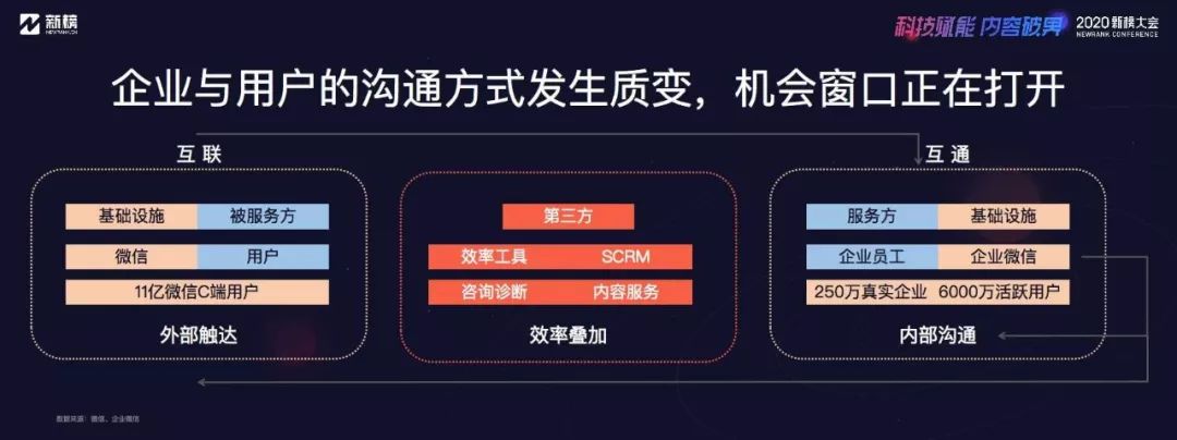 最終輸出的SOP手冊涵蓋三個(gè)功能,包括六大板塊,讓完全沒有新媒體經(jīng)驗(yàn)的新人,也能在短暫學(xué)習(xí)的基礎(chǔ)上,根據(jù)SOP手冊中提供的實(shí)操方法和案例模板,快速上手進(jìn)行內(nèi)容的生產(chǎn)、發(fā)布和運(yùn)營。而數(shù)據(jù)中臺除了矩陣數(shù)據(jù)的展示外,還具備賬號一鍵管理、本競品監(jiān)測、爆文分享等功能,后續(xù)還將上線在線課程、營銷工具和內(nèi)容稿庫,堪稱新媒體運(yùn)營的百寶箱。通過SOP手冊和數(shù)據(jù)中臺,來共同推動新媒體矩陣和私域管理的中心化、數(shù)字化和標(biāo)準(zhǔn)化。 二、好的戰(zhàn)略和架構(gòu) 最終還是要看組織能力和執(zhí)行效率 私域運(yùn)營就面臨著左右為難的狀況,尤其是個(gè)人號的管理。完全靠手工操作,效率低下;第三方輔助工具又處于灰色地帶,隨時(shí)面臨被封號的風(fēng)險(xiǎn)。 微信官方似乎正在主動改變這種狀況。個(gè)人微信、企業(yè)微信是微信生態(tài)中的基礎(chǔ)設(shè)施,一邊承載著11億C端用戶,一邊連接著250萬家真實(shí)企業(yè)。個(gè)人微信和企業(yè)微信的互通讓用戶和企業(yè)直接對話,實(shí)現(xiàn)了人即服務(wù),雙向互聯(lián)。而在企業(yè)微信框架之下的第三方開發(fā)和服務(wù),更加可靠安全,也能更好地為企業(yè)的用戶關(guān)系管理賦能。