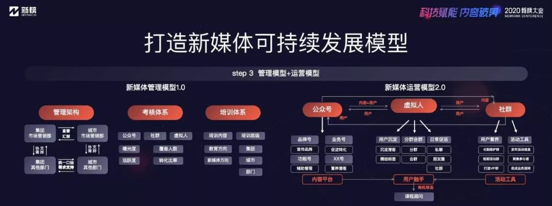 通過梳理,我們發(fā)現(xiàn)集團(tuán)已納入體系管理的公眾號共有443個(gè),分布在全國68個(gè)城市。我們面向運(yùn)營這些公眾號的一線小編發(fā)放并最終收回303份問卷,并做了11次電話深訪,其中8次面向集團(tuán)內(nèi)部,3次面向行業(yè)標(biāo)桿。試點(diǎn)學(xué)校的提升也非常明顯,在微信流量相對下滑的前提下,粉絲數(shù)實(shí)現(xiàn)逆勢增長,不管絕對數(shù)還是比例都好于2018年。 根據(jù)客戶矩陣運(yùn)營的實(shí)際情況,我們總結(jié)出兩個(gè)模型。首先是管理模型,界定了集團(tuán)與城市、市場與業(yè)務(wù)兩兩之間的關(guān)系和聯(lián)動,制定了公眾號、社群、虛擬人的量化考核機(jī)制,以及面向集團(tuán)、城市、部門三個(gè)層級的培訓(xùn)體系,培訓(xùn)的內(nèi)容又包括教育和新媒體兩大方向。然后是運(yùn)營模型,主要界定了公眾號、虛擬人、社群各自的功能定位和兩兩之間的關(guān)系聯(lián)動,以公眾號為內(nèi)容平臺并進(jìn)行分類,以社群為活動工具積累潛在用戶,將虛擬人作為運(yùn)營的核心和用戶觸手,最終將確定的商機(jī)導(dǎo)流給課程顧問。