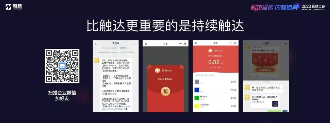 我們簡單展示幾個(gè)功能。這一頁展示的是企微通的紅包功能:用戶掃描企業(yè)微信活碼,添加企業(yè)員工的企業(yè)微信號,會收到提前設(shè)置好的歡迎語回復(fù),以及一個(gè)新人紅包。企業(yè)通過一次拉新活動將用戶留存在自己的企業(yè)微信內(nèi),方便后續(xù)持續(xù)推送信息和商品,與用戶產(chǎn)生更多的交互。
